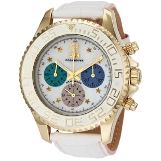 Full of glamour and unique style this women’s 3H Ocean diver titangraph watch bestows its wearer with dazzling charm. Its magnificent white Mother-Of-Pearl dial features: gold star hour markers, luminous 12 applied, luminous hour hands and three chronograph counter in green, rose, and blue. The titanium case PVD treated in gold, protective mineral crystal, 330 feet water resistance and manual winding chronograph function guarantee the renowned strength, durability and precision of the 3H Italia legacy. This watch set includes two interchangeable leather straps with a quick releasing system, making it wearable from everyday activity to glamorous evenings. Feel attractive and beautiful as you confidently wear this magnificent timepiece.