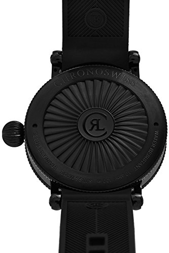 Black dlc-coated stainless steel case with a black rubber strap. Black dial with white hands and index-Arabic numerals hour markers. Minute markers around the outer rim. Dial Type: Analog. Luminescent hands and markers. Date display at the 12 o’clock position. ChronoSwiss Calibre C. 286 automatic movement with a 42-hour power reserve. Scratch resistant sapphire crystal. Screw down crown. Solid case back. Case size: 44 mm. Case thickness: 15.10 mm. Round case shape. Water resistant at 100 meters / 330 feet. Functions: date, hour, minute, second, retrograde display of weekday. Dress watch style. Watch label: Swiss Made. ChronoSwiss Timemaster Black Dial Automatic Mens Watch CH-8145-BK.