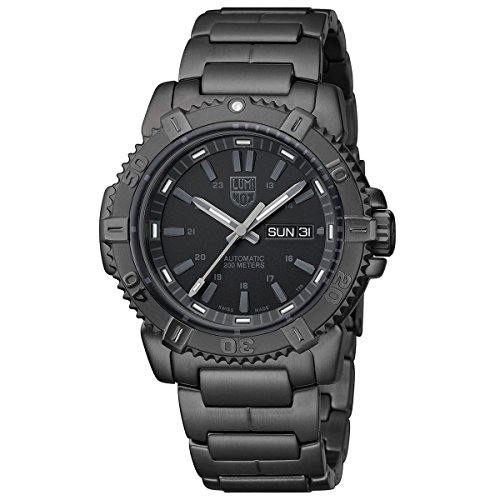Black PVD stainless steel case with a black PVD stainless steel bracelet. Uni-directional rotating bezel. Black dial with luminous hands and index hour markers. Minute markers around the outer rim. Dial Type: Analog. Day of the week and date display at the 3 position. Automatic movement. Scratch resistant sapphire crystal. Pull / push crown. Case diameter: 45 mm. Round case shape. Deployment clasp. Water resistant at 200 meters / 660 feet. Functions: date, day, hour, minute, second. Dress watch style. Luminox Modern Mariner Black Dial Black PVD Stainless Steel Mens Watch 6502.BO.