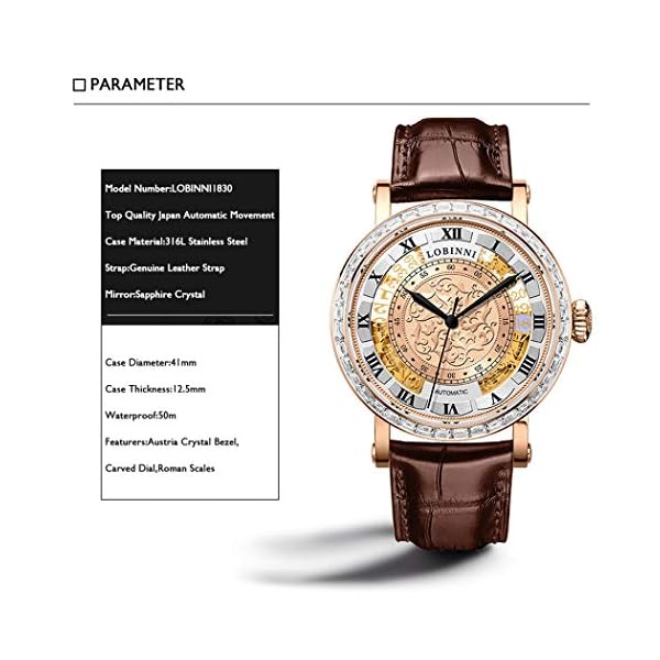 【Parameter & Detail:】the luxury watches for men detail: 1, Model No.:LOBINNI1830 2, Good Quality Japan Automatic Self Winf Mechanical Movement 3, Watches Case Material:316L Stainless Steel 4, Watches Strap:Genuine Leather Strap 5, Watches Mirror:Anti Scretch Sapphire Crystal 6, Case Diameter:41mm 7, Case Thickness:12.5mm 8, Waterproof:50m 9, Features:Austria Crystal Bezel,Carved Dial,Roman Scales,Date