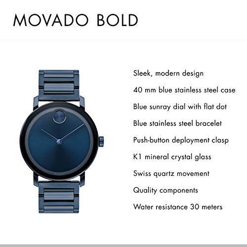 The Movado BOLD Evolution men’s watch represents refined rugged sophistication and is a streamlined modern vision with our stylish sunray dial. It features a thin 40 mm blue ion-plated stainless steel case and a blue sunray dial with matching sunray dot and hands. The blue ion-plated stainless steel link bracelet includes a secure deployment clasp that makes putting on and taking off your watch as easy as pushing a button. This iconic wristwatch for men includes all the quality components you expect from Movado. The K1 mineral crystal is more shatter-resistant than sapphire crystal and more scratch-resistant than regular mineral crystal. The Swiss quartz movement ensures the watch is accurate, reliable and requires minimal manual maintenance. The BOLD Evolution watch has a water resistance rating of 3 ATM.