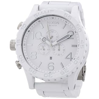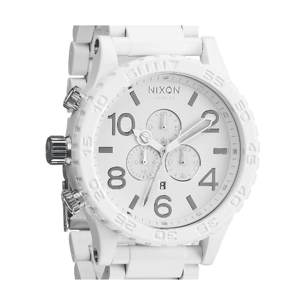 White PVD stainless steel case with a white PVD stainless steel bracelet. Uni-directional rotating white PVD bezel. White dial with white hands and Arabic numeral and index hour markers. Minute markers around the outer rim. Dial Type: Analog. Luminescent hands and markers. Date display at the 6 o’clock position. Chronograph – sub-dials displaying: three – 60 second, 60 minute and 24 hour. Quartz movement. Scratch resistant mineral crystal. Solid case back. Case diameter: 51 mm. Case thickness: 14 mm. Round case shape. Band width: 25 mm. Band length: 8.5 inches. Deployment clasp. Water resistant at 100 meters / 330 feet. Functions: chronograph, date, hour, minute, second. Casual watch style. Nixon 51-30 Chronograph White Dial White PVD Mens Watch A0831255.