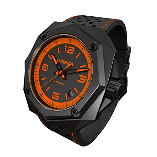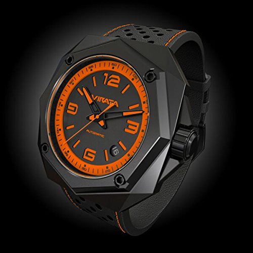 Individually Numbered, Limited Edition Model Patented Design Assembly in Ohio 44mm width case excluding crown 24mm lug width 316L Stainless steel Leather, perforated strap Miyota 9015 Movement, 28,800 VPH Sapphire Crystal with AR coating See-through Sapphire Crystal caseback 100M Water Resistance One Year Limited International Warranty Date function at 4:30 Bead Blast, Black PVD Case Black Dial, Orange Numbers Super-Luminova Numbers, Hour markers