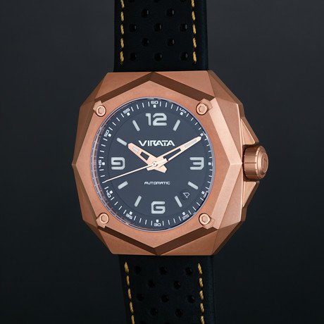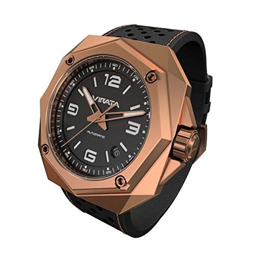 Individually Numbered, Limited Edition Model, Patented Design, Assembly in Ohio, 44mm width case excluding crown, 24mm lug width, 316L Stainless steel, Leather, perforated strap, Miyota 9015 Movement, 28,800 VPH, Sapphire Crystal with AR coating, See-through Sapphire Crystal caseback, 100M Water Resistance, One Year Limited International Warranty, Date function at 4:30, Bead Blast, Rose Gold color PVD Case, Black Dial, White Numbers, Super-Luminova Numbers, Hour markers
