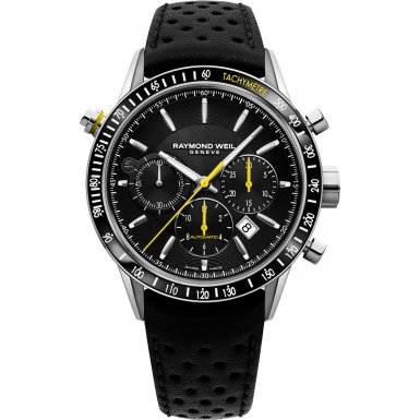 Stainless steel case with a black leather strap. Fixed stainless steel bezel with a black PVD top ring showing tachymeter markings. Black dial with luminous silver-tone hands and index hour markers. Minute markers around the outer rim. Dial Type: Analog. Luminescent hands and markers. Date display between the 4 and 5 o’clock positions. Chronograph – three sub-dials displaying: 60 second, 30 minute and 12 hours. Automatic movement. Scratch resistant sapphire crystal. Screw down crown. Transparent case back. Case size: 43.5 mm. Case thickness: 13.7 mm. Round case shape. Fold over clasp with a double push button release. Water resistant at 100 meters / 330 feet. Functions: chronograph, tachymeter, date, hour, minute, second. Luxury watch style. Watch label: Swiss Made. Raymond Weil Freelancer Chronograph Automatic Men’s Watch 7740-SC1-20021.