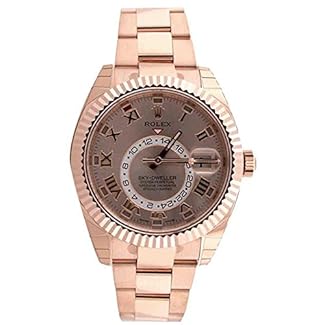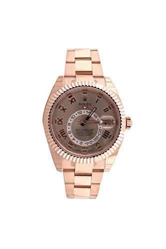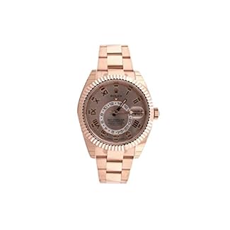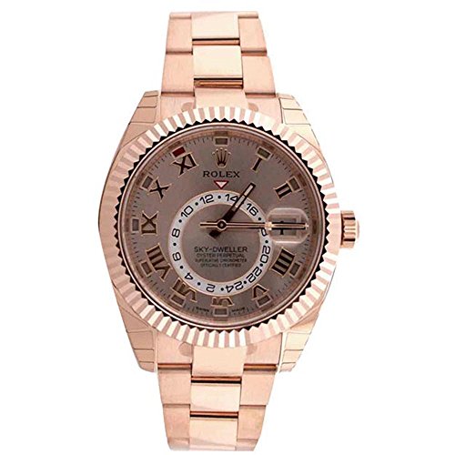 18kt everose gold case with a 18kt everose gold bracelet. Bi-directional rotating bezel. Sundust dial with luminous hands and Roman numeral hour markers. Minute markers around the outer rim. Dial Type: Analog. Date display at the 3 o’clock position. Gmt sub-dial. Automatic movement. Scratch resistant sapphire crystal. Screw down crown. Case diameter: 42 mm. Round case shape. Folding oysterlock clasp. Water resistant at 100 meters / 330 feet. Functions: GMT, second time zone, hour, minute, second. Luxury watch style. Watch label: Swiss Made. Rolex Sky Dweller Sundust Dial 18kt Everose Gold Men’s Watch