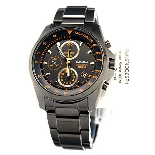 Black PVD stainless steel case and bracelet. Fixed black PVD bezel with tachymeter. Black dial with luminous hands and index hour markers. Minute markers. Tachymeter scale appears around the outer rim. Dial Type: Analog. Date display at the 4 o’clock position. Chronograph – three sub-dials displaying: 1/20 second, 60 minute and 12 hour. Quartz movement. Scratch resistant Hardlex crystal. Case diameter: 45 mm. Case thickness: 12 mm. Round case shape. Deployment clasp. Water resistant at 100 meters / 330 feet. Functions: chronograph, date, hour, minute, second. Sport watch style. Seiko Black Dial Chronograph Black PVD Stainless Steel Mens Watch SNDD65.